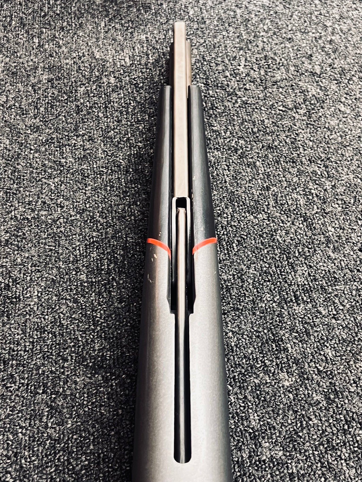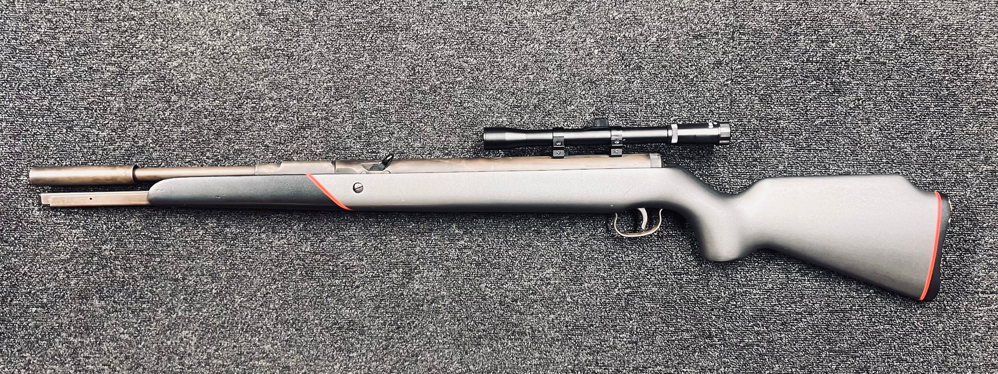 The stock appears to be an original Model 50 stock; however, it has been refinished in a unique, one-off matte grey scheme with red accent striping. We cannot confirm whether this was a limited factory treatment or a high-quality custom refinish done later. The work presents well and complements the Parkerized metal finish, but buyers should consider it a custom or non-standard finish unless further provenance is established.
